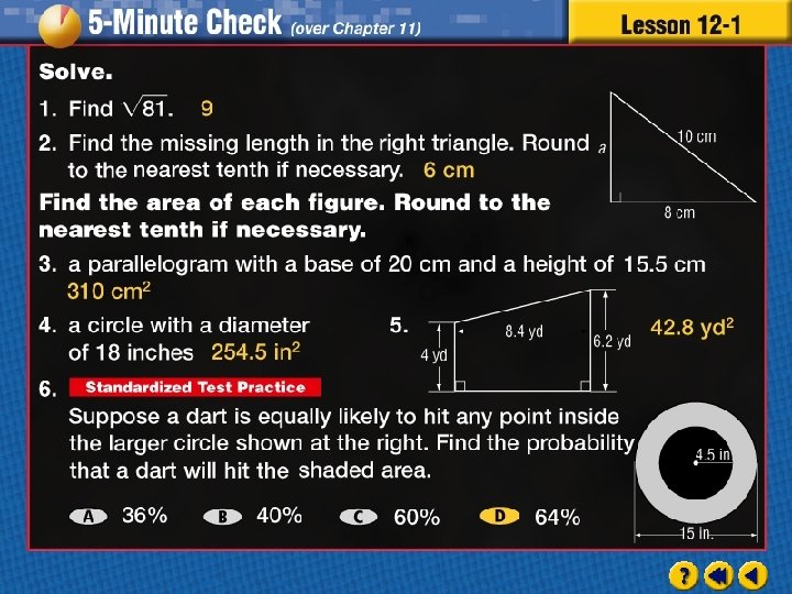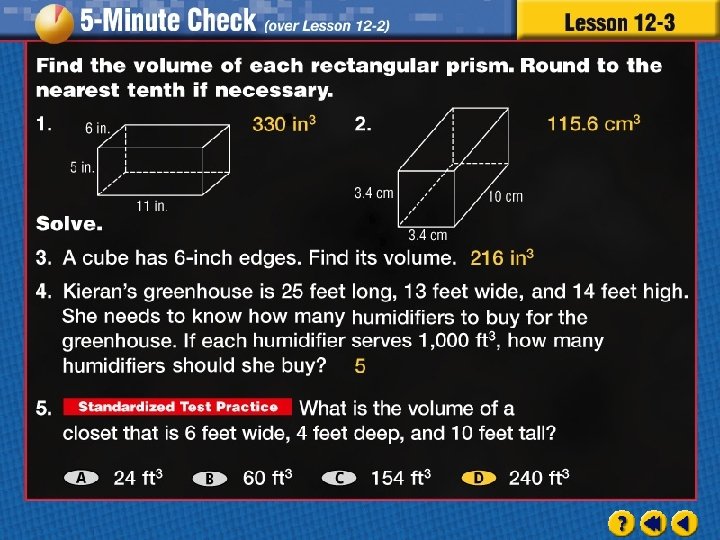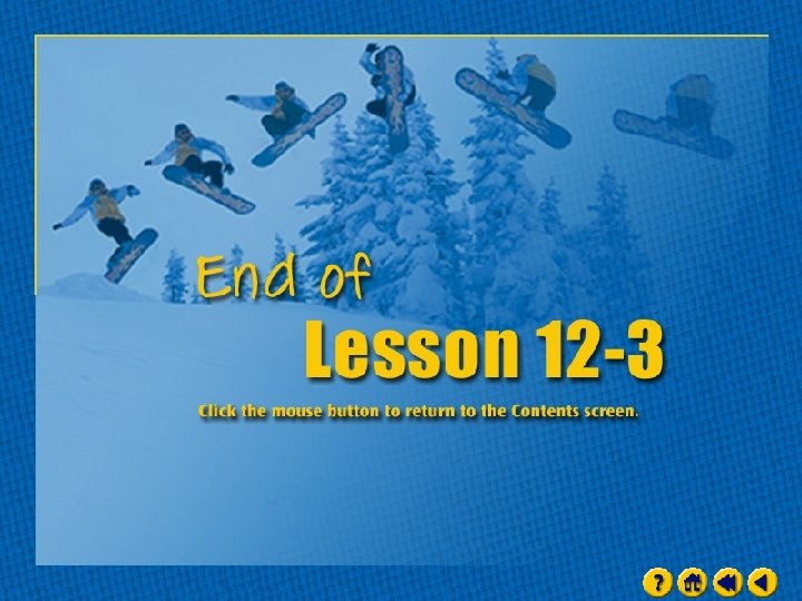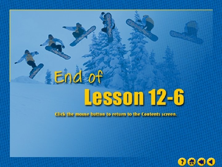 To navigate within this Interactive Chalkboard product: Click the Forward button to go to the next slide. Click the Previous button to return to the previous slide. Click the Section Back button to return to the beginning of the lesson you are working on. If you accessed a feature, this button will return you to the slide from where you accessed the feature. Click the Main Menu button to return to the presentation main menu. Click the Help button to access this screen. Click the Exit button or press the Escape key [Esc] to end the current slide show. Click the Extra Examples button to access additional examples on the Internet. Click the 5 -Minute Check button to access the specific 5 -Minute Check transparency that corresponds to each lesson.
