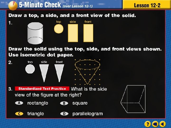 Lesson 12 -1 Drawing Three-Dimensional Figures Lesson 12 -2 Volume of Rectangular Prisms Lesson 12 -3 Volume of Cylinders Lesson 12 -4 Surface Area of Rectangular Prisms Lesson 12 -5 Surface Area of Cylinders Lesson 12 -6 Precision and Measurement