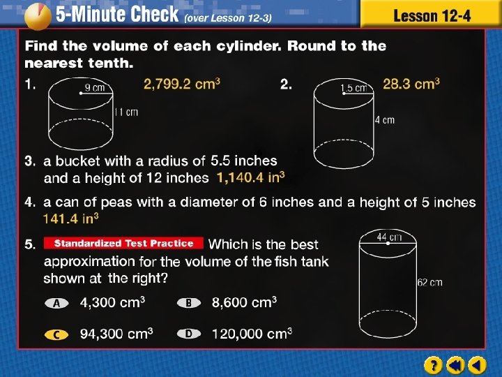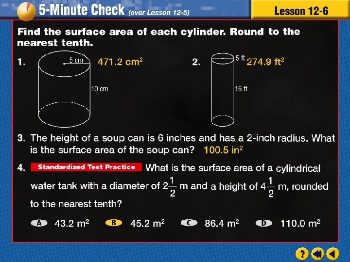 MULTIPLE-CHOICE TEST ITEM Find the volume of a cylinder-shaped coffee can that has a diameter of 3 inches and a height of 6 inches. A B C Read the Test Item To find the volume, use the formula D