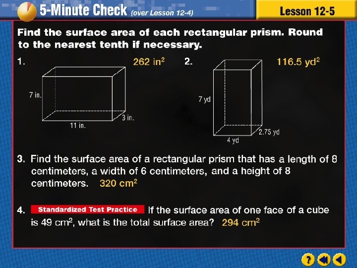 BOXES Drew is putting together a cardboard box that is 9 inches long, 6 inches wide, and 8 inches high. He bought a roll of wrapping paper that is 1 foot wide and 3 feet long. Did he buy enough to wrap the box? Explain. Step 1 Find the surface area of the box. Step 2 Find the area of the wrapping paper. 1 ft 3 ft area Answer: Since 432 > 348, Drew bought enough wrapping paper.