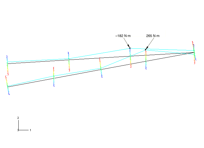 Effigy 4. Bending moment diagram (moment about beam ane-centrality) for elements in display group MainA. The locations with the highest stress (created by the bending of the elements) are indicated.