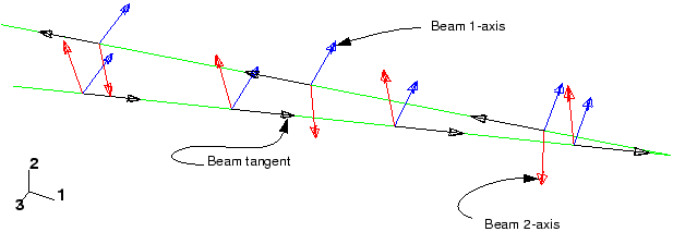 The resulting plot is shown in Figure 2. The text annotations in Figure 2 that identify the section axes and beam tangent will not appear in your image. The vector showing the local axle 1-centrality, , is blue; the vector showing the beam 2-axis, , is red; and the vector showing the beam tangent, , is white.